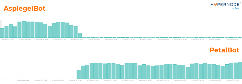 We have been informed that last week the notorious AspiegelBot has morphed into the PetalBot. This PetalBot continues to be a very aggressive and unfriendly robot which does not respect the robots.txt file. The graph below shows the transformation in activity on our Hypernode platform.