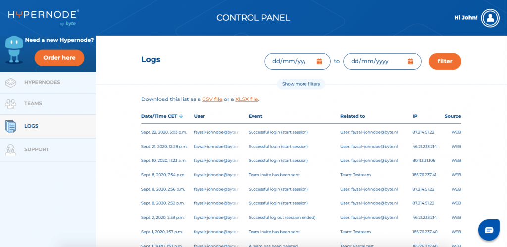 On the Logs page you can view all the events happening on the Hypernode(s) and Team(s) you have access to. It also shows logs regarding your personal account. The log page comes with nice filtering on the most essential components.