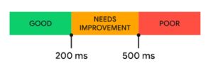 A good Interaction to Next Paint score is lower than 200m2. If you have a score between 200ms and 500ms, your page definitely needs improvements. A bad INP score is more than 500ms according to Google.