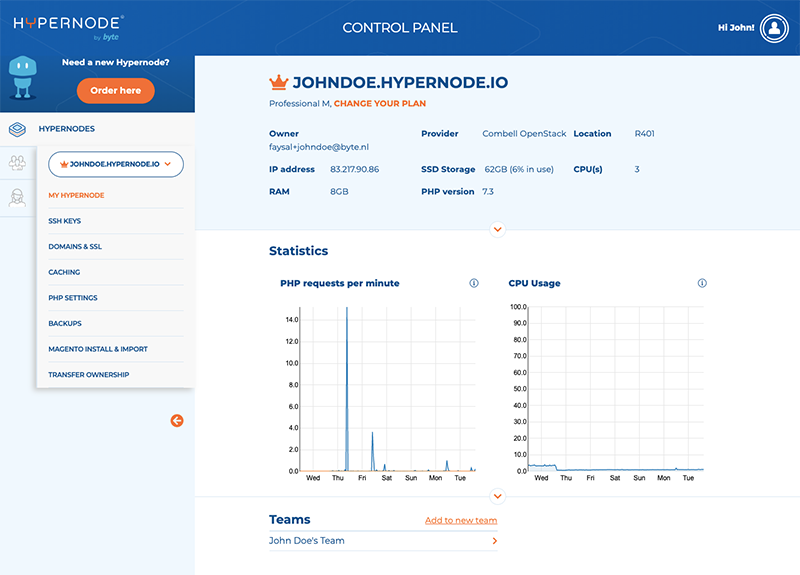 In the renewed ‘My Hypernode’ page in the Control Panel, we’ve now incorporated general Hypernode settings and the charts from MageReport Premium. All you need to know about your Hypernode can now be found in one accessible overview.