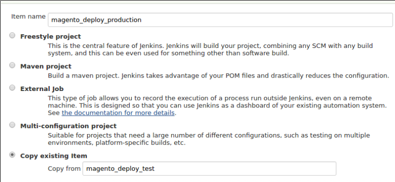 For the production job, click New Item again but this time instead of selecting Freestyle project select Copy existing Item and enter the name of the deploy test job.