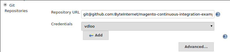 Select Git from Source Code Management, add your credentials if necessary and enter the repository URL. In this example that would be https://github.com/ByteInternet/magento-continuous-integration-example.git