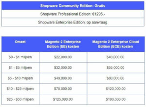 Zoals je ziet is de instap voor relatief kleine shop qua kosten in ieder geval makkelijker bij Shopware. De prijzen van Shopware zijn een stuk transparanter omdat je een eenmalige fee betaald, terwijl dit bij Magento shops afhankelijk is van je omzet. Hoe meer omzet hoe meer je gaat betalen: boven de 1 miljoen euro kom je in een hogere staffel.