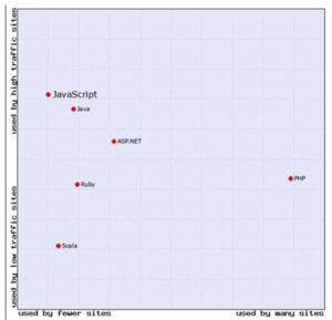 Zo zijn programmeertalen die gebaseerd zijn op JavaScript aan een enorme opmars bezig en zien we dat JavaScript relatief gezien veel gebruikt wordt op websites met veel verkeer:
